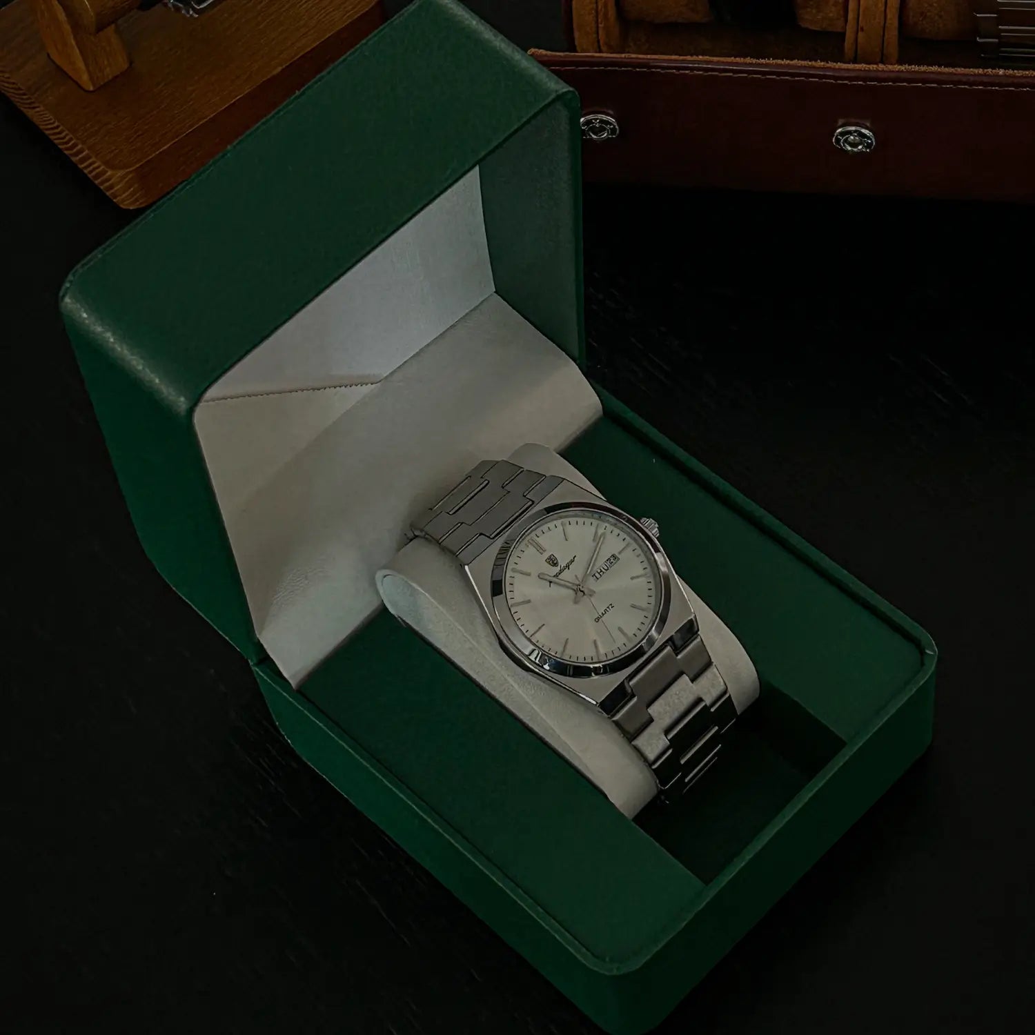 Confeccionada com o mais fino couro, emana sofisticação e luxo. O ambiente perfeito para acomodar cada relógio com delicadeza e cuidado.