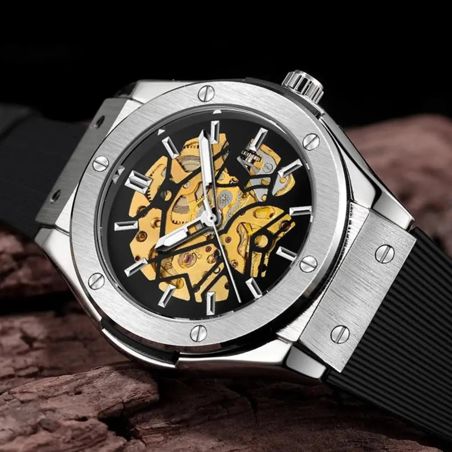 Em um universo onde o tempo é uma arte em movimento, o relógio Empire é uma obra-prima de engenharia e elegância. Inspirado pelo desejo de revelar a beleza oculta do maquinário interno, oferece uma visão sem precedentes do coração pulsante de um relógio de alta precisão.